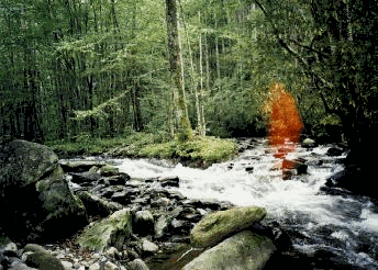 Ms. Mock took this photograph near a river in a forest preserve. There is no direct sunlight that would cause this type of lens flare effect and it surely isn't the first or last picture on a roll of film because the reddish blur is near the center of the photograph. It actually takes on the shape of a human being. |